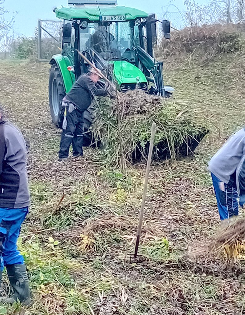 Naturschutzwart Rolf Braunmüller hatte für den Samstag, 02. November 2024 zum jährlichen Arbeitseinsatz aufgerufen, und konnte sich über eine gute Beteiligung freuen. Um 9.00 Uhr trafen sich bei frischem, aber trockenem Wetter 13 Helfer an der Oberweilerhüle, ausgerüstet mit den nötigen Arbeitsgeräten, dazu mehrere Traktoren mit Anhänger. Nach kurzer Besprechung teilte Naturschutzwart Rolf Braunmüller zwei Gruppen ein, einmal mit den Arbeiten an der Oberweilerhüle, und die zweite Gruppe mit den Pflegemassnahmen an der