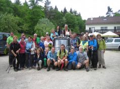Um 07:45 Uhr begann in Ehingen die diesjährige Tour, begleitet durch Bürgermeister Bernd Mangold, mit dem Ziel Berghülen. Bei kurzen, heftigen Regenschauern setzte sich der Trupp in Bewegung. Entlang der Schmiech ging es zum ersten Zwischenstopp nach Berkach. Erfreulicherweise klarte das Wetter allmählich auf, und die Teilnehmer konnten trockenen Fußes ihre Tour fortsetzen. Der Weg führte weiter entlang des „Happentals“ mit einem kurzen Aufstieg nach Hausen o. A. Wie üblich waren wieder die Begleitfahrzeuge zur Aufnahme von Wandergepäck und Bereitstellung von Getränken für die Wandergruppe mit dabei. Nach einer kurzen Verschnaufpause führte der Weg weiter vorbei an Altheim, bergab ins „Siegental“, vorbei am Zementwerk „Schwenk“ zum „Siegentalhof“ mit einer anschließenden halbstündigen Vesperpause. Bei frischen Butterbrezeln, Kaffee oder Sekt, die bereits von den Helfern der Begleitfahrzeuge vorbereitet wurden, konnte für die nächsten Ziele Kraft getankt werden. Angeführt von Wanderführer Hansjörg Dick umrundeten die Naturfreunde den „Schmiechener See“ und trafen am Vatertag weitere Wanderlustige, die sich auf den Weg nach Schmiechen ins Festzelt machten. Nach einem kurzen Stopp musste ein weiterer Anstieg zwischen dem „Erzberg“ und „Egelsberg“ bewältigt werden, vorbei am ehemaligen Zementwerk von Sotzenhausen, weiter zur Mittagsrast in der „Waldschenke“. Nach eineinhalbstündiger Mittagspause und dem obligatorischen Gruppenbild machten sich die Wanderer frisch gestärkt mit weiteren Teilnehmern, die der Gruppe während der Mittagspause beigetreten waren, weiter auf den Weg durchs „Riedental“. Bei nun optimalen Wanderbedingungen und leichtem Sonnenschein ging es durch blühende Blumenwiesen bergauf vorbei am „Nägelesfels“ und „Höllfels“ auf das „Kühnenbuch“, weiter an „Gräters Hütte“