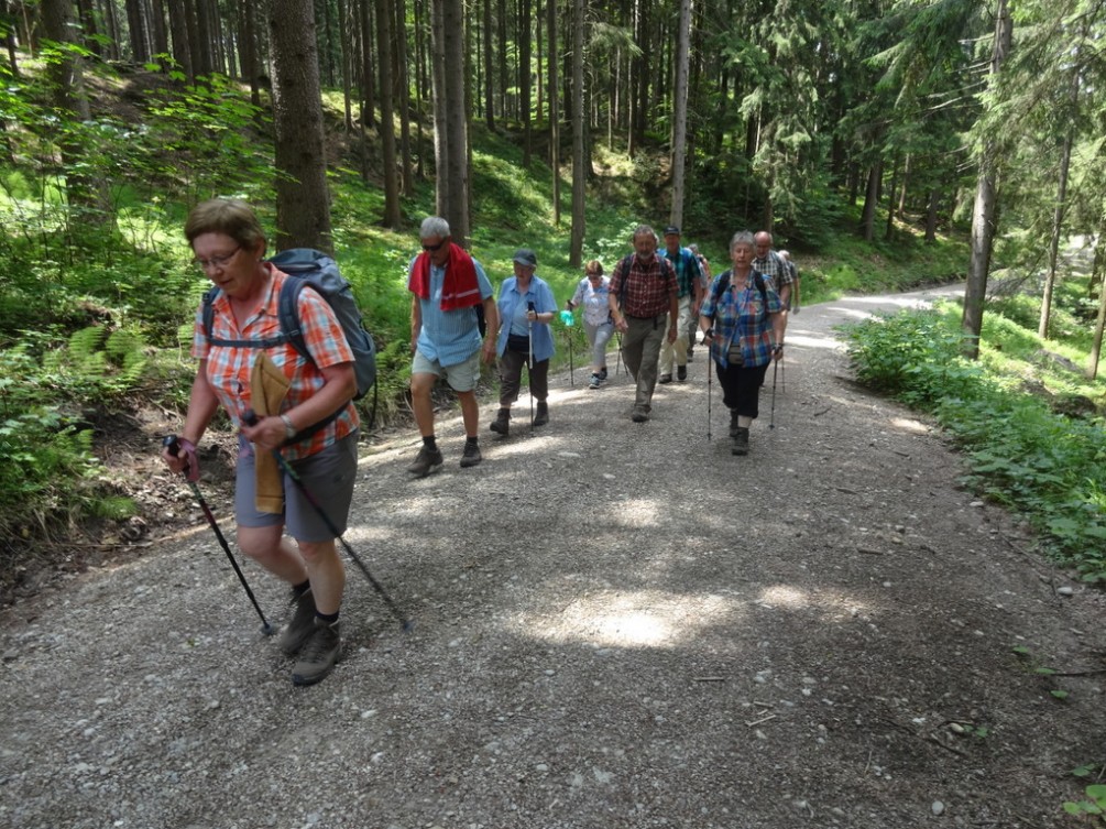Wieder um 8.30 Uhr starteten wir am Samstag nach Aschau und fuhren mit der Bergbahn auf die Kampenwand. Auf dem Panoramaweg wanderten wir zur Steinlingalm, wo dann eine größere Gruppe den Aufstieg hinauf zum Ostgipfel machte. Belohnt wurden alle durch eine herrliche Aussicht auf den Chiemsee und weit hinein ins Land. Etwa die Hälfte der Teilnehmer fuhr mit der Bergbahn wieder ins Tal, die andere Hälfte stieg auf steinigem Weg ab von der Steinlingalm zur Talstation. Auf der Heimfahrt machten wir einen Abstecher hinauf auf die Seisser Alm, wo wir auf der Terrasse des Hotels einkehrten und einen wunderschönen Ausblick auf die Landschaft und den Chiemsee genießen konnten.Das Freilichtmuseum Schliersee von Markus Wasmeier war das Ziel am Sonntag. In Miesbach stieg eine Wandergruppe mit 16 Teilnehmern aus und wanderte über die Stadlalm und der Schliersbergalm über ca. 18 km zum Schliersee. Im Freilichtmuseum wurden mit einer Führung die alten Bauernhäuser besucht, auch konnte man eine Volkstanzvorführung genießen. Danach schaute sich die Gruppe die Whisky-Destillerie Slyrs an. Die Rückfahrt erfolgte dann entlang des Simssees nach Eggstätt.