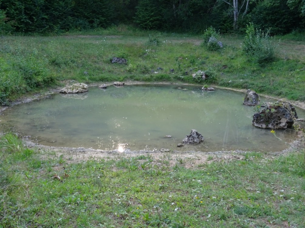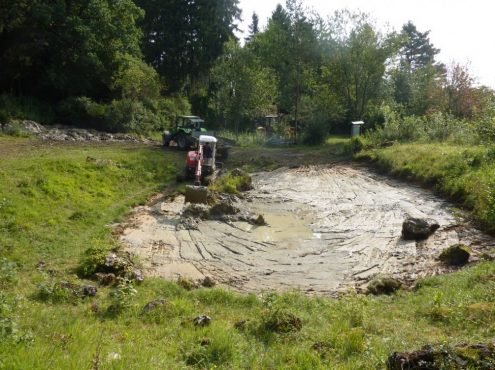 Deswegen stand jetzt eine größere Aktion an, vorbereitet von Hans-Joachim Mayer und Naturschutzwart Georg Kast: Mit Hilfe eines Baggers wurde die Hüle vom stark wuchernden Schilf- und Binsenwuchs befreit, außerdem wurde Schlamm abgetragen. Eine knifflige Aufgabe für Baggerführer Hans Zeifang, der von Naturschutzwart Werner Hinz unterstützt wurde. Denn die zur Abdichtung des Wasserlochs nötige Lehmschicht durfte nicht beschädigt werden durch die Raupen oder die Schaufel des Baggers. Der Hülenboden wurde planiert, ein Regenzulauf angelegt. Die Sohle blieb dicht, die Hüle hat sich teilweise schon wieder mit Regenwasser gefüllt.