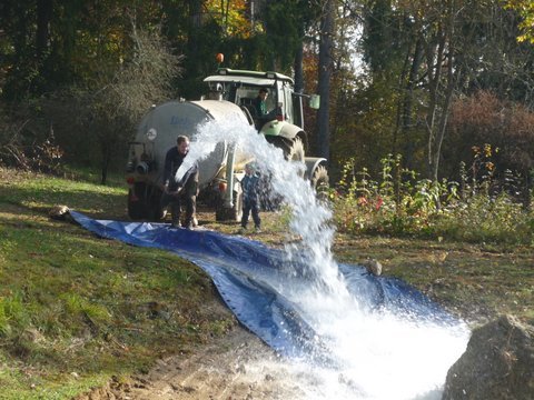 Mit den Traktorgespannen von Rosenbauer Helmut Braungart und von den beiden Naturschutzwarten Werner Hinz und Georg Kast wurde am vergangenen Samstagvormittag die ausgebaggerte Haldenhüle wieder vollständig mit Wasser befüllt. Das Wasser, das jetzt noch eine gelbliche Färbung durch den Lehmboden hat, wurde p1140066-001dscf1415über eine lange Plane von den Fässern in die Hüle geleitet. Bald wird sich wieder Leben im Wasser regen, spätestens im Frühjahr nach der Krötenwanderung. Danke an alle beteiligten Helfer für ihren Einsatz.